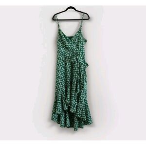 The Eliza J Green White Floral Print Plus Size 18 High/Low Faux Wrap Midi Dress is a stylish and elegant option for various occasions such as weddings, parties, or formal events. This sleeveless dress features a V-neckline, spaghetti straps, and a flattering fit & flare silhouette. Made from chiffon material with a ruffle accent and zipper closure, it has a modern yet feminine design. The dress's high-low hem adds a touch of sophistication, making it a versatile choice for different seasons like spring or summer.