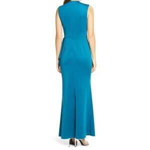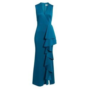 ELIZA J NEW $198 Sleeveless Ruffle Stretch Satin Gown in Peacock Size 2
