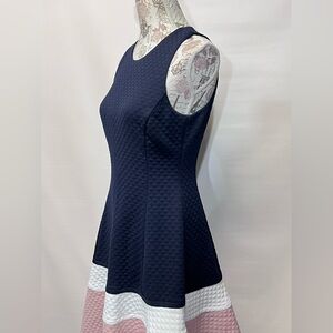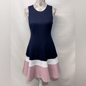 Navy blue, white and pale pink color block dress by ELIZA J, size 6. Dress is sleeveless, scoop neckline and has full skirt.