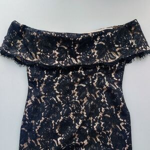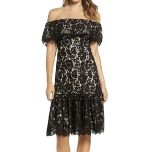 ELIZA J Off Shoulder Lace Midi Dress 8 Black Lace Overlay Nude Ruffle Hem