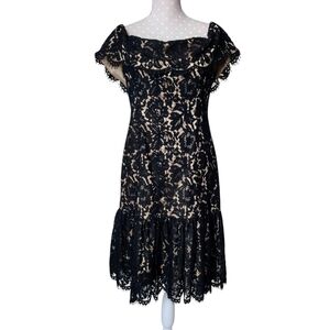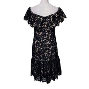 ELIZA J Off Shoulder Lace Midi Dress 8 Black Lace Overlay Nude Ruffle Hem Women's Size 8