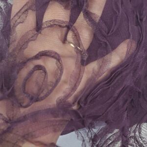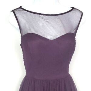 This elegant sleeveless dress features a rich purple hue, perfect for any occasion. The design offers a flattering fit with a stylish sheer neckline. Lined and has floral rosette sheer skirt. Also has built in bra.