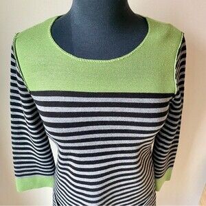 Gray and black stripes with green color blocking at neckline / hem / cuffs