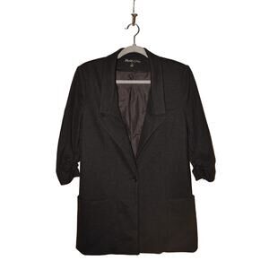 Elevate your wardrobe with this Elizabeth & James Ruched Sleeve Blazer, a chic and versatile piece perfect for both work and casual settings. Crafted from a comfortable ponte knit, this gray blazer features stylish ruched 3/4 sleeves, adding a modern touch to the classic silhouette. The notched collar and single-button closure create a clean, tailored look, while the two front pockets add both style and practicality. The relaxed fit allows for easy layering over blouses, dresses, or casual tops. Whether paired with tailored pants for the office or jeans for a more laid-back vibe, this Elizabeth & James blazer effortlessly enhances any outfit. Lined; Front pockets