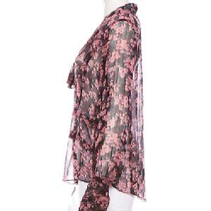 Sheer black, pink silk blouse with floral print, french cuffs, tie at neck and front button closures