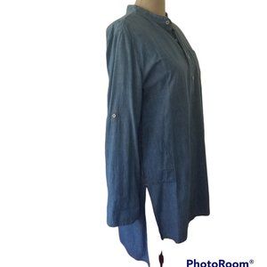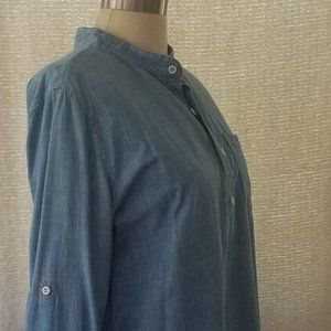 ELIZABETH and JAMES Chambray Tunic - Size Medium - Elizabeth and James tunic is soft and light chambray. Pullover with mandarin collar with four buttons in front; pocket on left front; two side pockets front and back; yellow and topstitching detail; roll tab sleeve option; high low hem; side slits. Brand tag is missing but RN# is for Elizabeth & James. Excellent condition - no damage, no stains.
