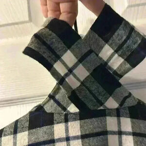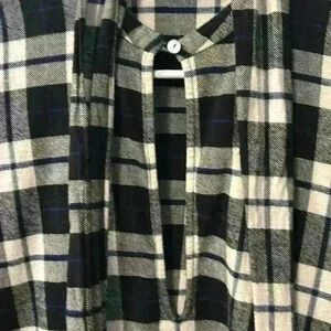 Unique Women’s Flannel Blouse/Pullover, deep v-neck with silver button closure, long sleeves with silver button cuffs, attached fringed scarf/tie, black and white plaid with tiny lines of blue
