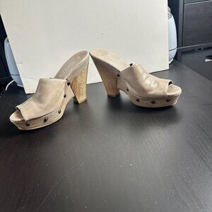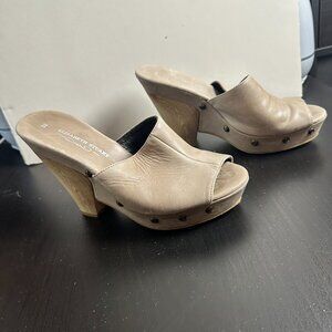 ELIZABETH STUART Studded Neutral Leather Platform Heels Sandals Wood Size 39