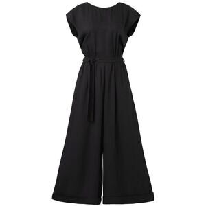 The Black ELK Wide Leg Jumpsuit is crafted from a cool feel fabric with a flattering and lightweight drape. It features a sweet capped sleeve and a slightly dropped waist and crotch. A slim flat-band waist has small gathers for a touch of tailoring to help accentuate a voluminous wide leg shape which sits at a 7/8th length crop and drapes like a skirt around the legs.
