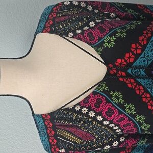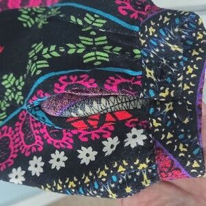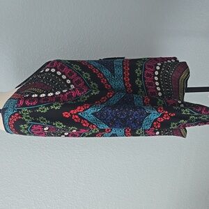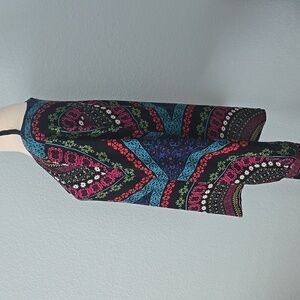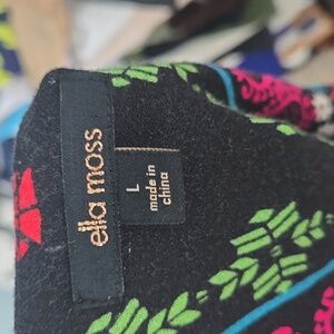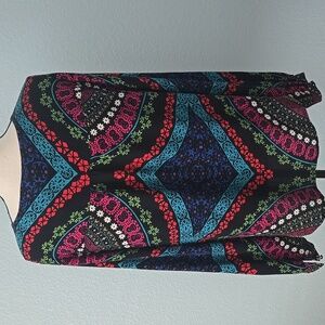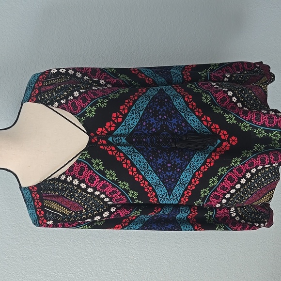 ELLA MOSS Black V Neck Tassel Cord Tunic Size Large Bright Mandala Print Boho. Rounded hemline. Buttoned sleeves. Gently pre owned condition.