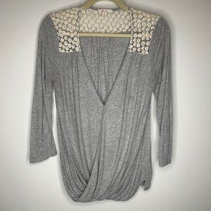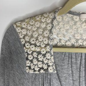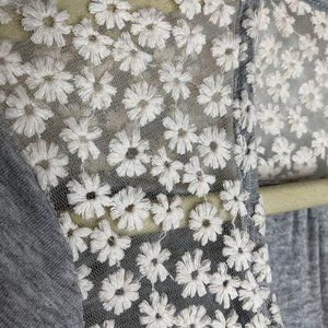 Ella Moss Gray Drape Wrap Front Top with Sheer Embroidered Daisies Sz M