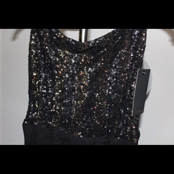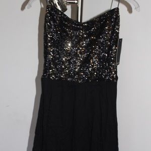 Strapless black dress. Top is sequins bottom silk. Dress length longer in back than front. Please note two available. Only size medium has tag - must have fallen off. Brand new never worn