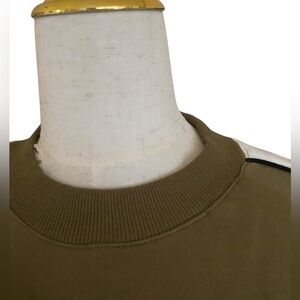 ElleAndEmme Stylish olive green crewneck fleece sweatshirt featuring a distinct design of white stripes and black star detailed sleeves, a common motif in ElleandEmm designs. Perfect for casual wear for fall & winter Slightly oversized comfortable size MEDIUM
