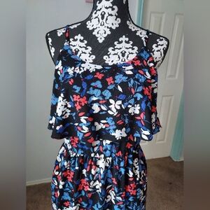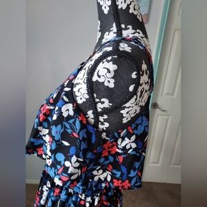 Adjustable spaghetti straps. Black base, blue, red, white floral.