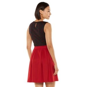 Add French flair to your wardrobe with this women's ELLE dress. Flocked Eiffel Tower appliques on the bodice combine with a pleated skirt to give you a fun, feminine look. In black/red