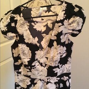 Pretty black and cream floral print dress. Cute gathered cap sleeves. Excellent condition.