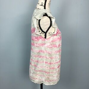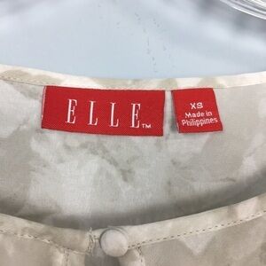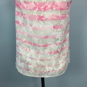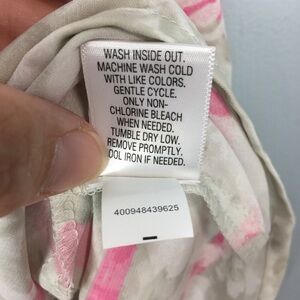 Pull on style.  Scoopneck with keyhole and button closure in center front neckline.  Cream, tan and pink floral print with horizontal stripes.  100% polyester.  Machine wash inside out, tumble dry low.