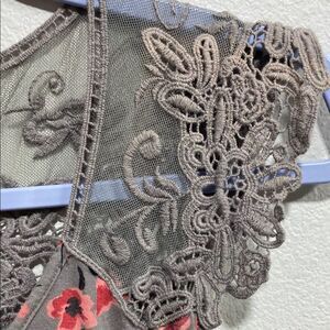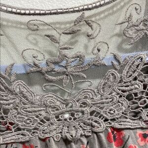 ELLE Gray Floral Lace Yoke Cap Sleeve Top S Pima Cotton Modal