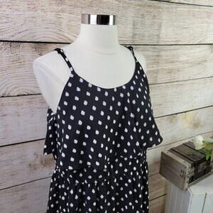 ELLE Polka Dot Spaghetti Strap Dress Black White Size Medium. Cute A-Line Polka Dot Black and White Dress. Adjustable Spaghetti Straps. Layered tiered ruffle top. Elastic waist. 100% Polyester. Size Medium. Excellent Used Condition.