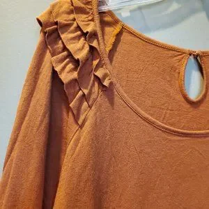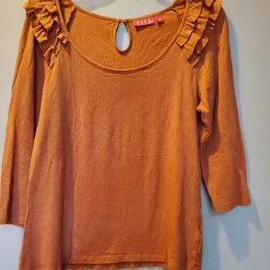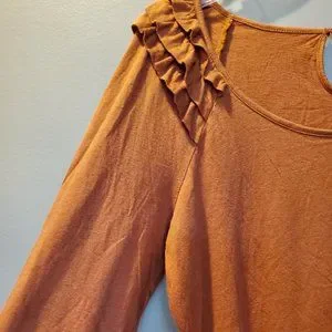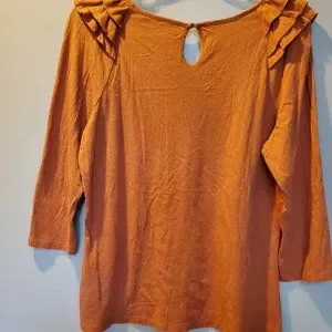 Rust knit ruffle shoulder 3/4 sleeve Underarm across the front 19 Underarm length 16" Sleeve 20
