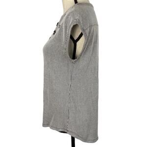 ELLE Micro Stripe Scoopneck Blouse Short Sleeve Top with Flower Sequin Along Neckline Womens Size XS