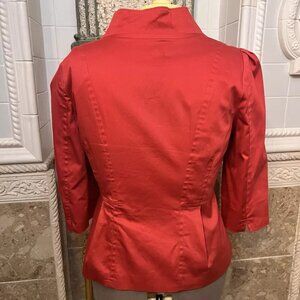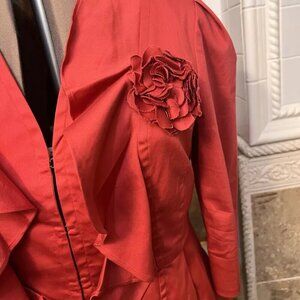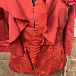 ELLE. Size Large. Cotton Spandex. Ruffled. Hook Front Jacket or Top. Red. Peplum. Fabric Flower Pin. Shoulder to hem 24". Sleeve 18". Bust 19.5/39". Dry clean.