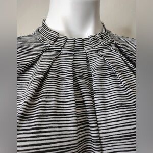 Chic and lightweight sleeveless blouse by ELLE in a modern black and white striped pattern. Features a gathered mock neckline for a stylish, polished look. Perfect for layering under blazers or wearing solo for a casual yet classy outfit. Size Medium. Made in the Philippines. Excellent pre-owned condition.