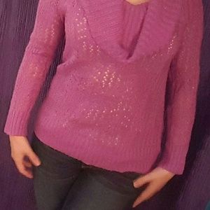 Open knit cowl neck sweater features a bit of shine with metallic accents. Dusty Rose color is gorgeous and this sweater is a flattering fit. Great with jeans or nicer slacks. Very good condition. (Other sites sell this sweater used for $25-40.)