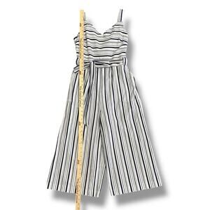 ELLE Women’s Striped Jumpsuit L Navy White Belted Wide Leg Cropped Summer Outfit