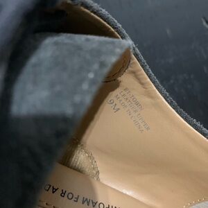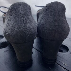 Step into fall with the charcoal gray suede wedges with wingtip oxford styling from Ellen Tracy. Technifoam for advanced comfort. Leather upper, rubber sole. Runs true to size. Excellent condition, hardly worn. Only flaw is size sticker was not fully removed inside shoe. Color is best represented in image with white background which is a stock photo. All other pics are actual shoes.