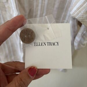 This Ellen Tracy blouse in a soft cream hue features a relaxed, boxy fit and elegant bell sleeves. The buttoned design adds a touch of sophistication, making it a versatile addition to any wardrobe.