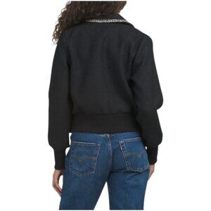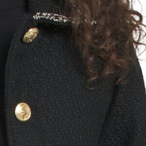 2 front button pockets, ribbed cuffs and hem, boucle knit texture, tweed trim