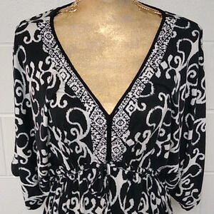 SO SOFT TEE SHIRT FEEL STRETCH KNIT, WILL FEEL LIKE YOU'RE IN YOUR PAJAMA'S. DRAWSTRING EMPIRE WAIST, 1/2 TO 3/4 DOLMAN SLEEVES. V-NECK IS ACCENTED WITH BORDER PRINT. THE BOTTOM IS ACCENTED WITH A BLACK BORDER. THIS WILL FIT A WIDE VARIETY OF SHAPES & SIZES.