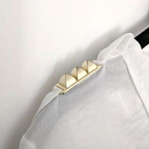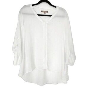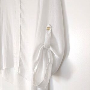 Sheer, loose fitting, white blouse made by Ellen Tracy in size Small. Gold colored accents along shoulders (some show minor wear, picture 4-5) and on roll tab sleeve buttons (pictures 6-7). Sleeves can be worn long or rolled up and fastened with built-in roll tab straps (as shown in pictures). Pleat down the center back. Pairs well with skinny pants and heels. In EUC with no holes, snags, or stains. Bundle with other items in my closet for the best deal!