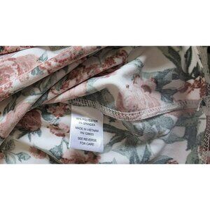 The product is a women's blouse made of polyester fabric. It features a round neck, sleeveless design, and a floral pattern. The blouse has a relaxed fit and comes in a plus size 1X. It has a pullover closure and is machine washable. The blouse has metal accent gold color feature at neck line and is suitable for casual occasions during the spring season. The brand is ELLEN WEAVER. Please review measurement pics to ensure fit.