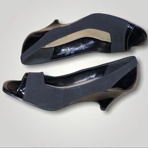 ELLEN TRACY 8.5M Black Wedge Shoes Patent Suede cloth ET Pacer Peep Toe