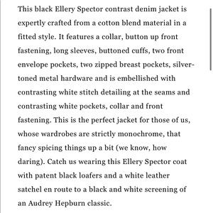 ELLERY Unisex Spector Black Denim Jacket With White Patent Detailing. Beautiful, Elegant and Chic; Fitted and Comfortable. Size US2 but could fit a US 6/8. New without tags; very minor dye sign on the color as shown in pictures, barely noticeable.