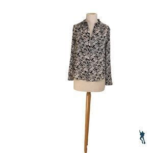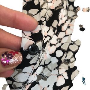The primary colors are black, grey, white and a bit of pink. This floral blouse has the most beautiful buttons. They appear to be malachite or a metallic black.
