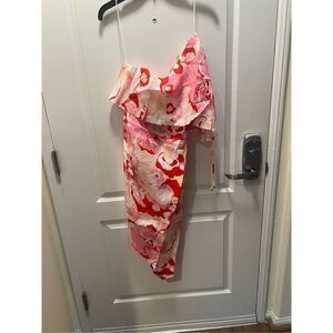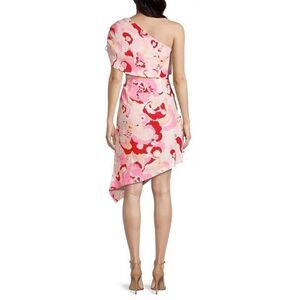 This one-shoulder dress is adorned with a vibrant floral print and an asymmetrical hem. One-shoulder neckline One cap sleeve Side zip Linen Hand wash Imported of Imported fabric SIZE & FIT About 42" from shoulder to hem Model measurements: 5'10" tall Model is wearing a US size Small.