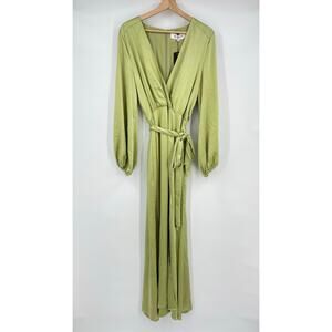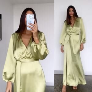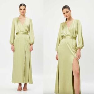 ELLIATT | Kai Maxi Dress in Avocado Green Satin Surplice Balloon Sleeve L