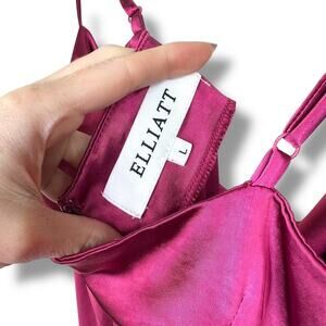 ELLIATT Revolve Jacinda Berry Pink Satin Drape Faux-Wrap Asymmetrical Midi Dress. Cowl Neck, Partially Lined, Adjustable Straps, Back Zipper. Some Stretch