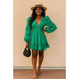 ELEGANT GREEN V-NECK RUFFLE CUT-OUT BACK Mini DRESS 👗 WITH LONG SLEEVE