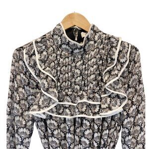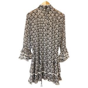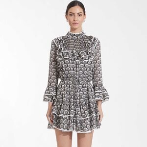 Mini in length, the Syrma Dress boasts an effortless appeal with its high neckline, ruffled detailing with white trimming and tiered flute sleeves. Dress up or down for your next outing.