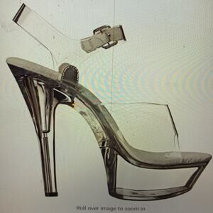 Finely Crafted Dancing Heels w/an inner sole of soft comfy durable fabric —1 1/2” plastic over instep — ankle strap in plastic w/adjustable silver tone buckle —2” platform 6” heel .small holes on inner side of foot —cooling foot off . SZ 7