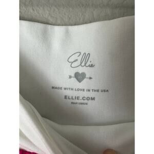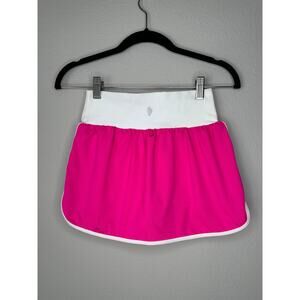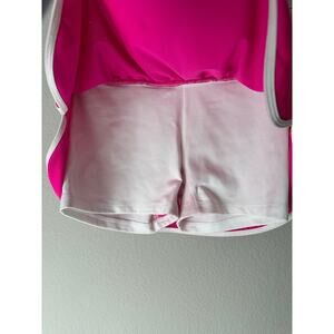 Cute cross front mini tennis skort by Ellie. Features a 3 inch wide lay flat cross front waistband with perforated mesh material and athletic stripe trim hem and borders. Has biker shorts underneath. Color is hot pink and white.