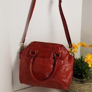Beautiful red color, outside pockets on front and back. Zipper pocket and elastic pocket on the inside. Leather, clean inside and out.