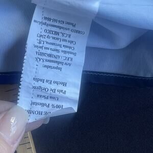 Tag details: Spanish care/content tag indicates 100% poliester; Hecho en India (Made in India)