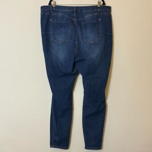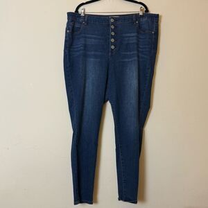 ELOQUII Gena Fit Peach Lift Button Fly Jeans, Size 22 Dark Wash- Gena Fit - designed exclusively for a body shape with a fuller mid-section and narrower hips and thighs. Made with our booty lifting denim technology, these jeans are ultra-flattering while still maintaining their ultra-comfortable fit all day. These toothpick skinnies can be worn with sandals or tucked into boots for year round wear.
