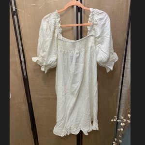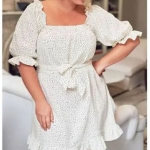 ELOQUII Plus Linen Blend Smocked Ruffle Mini Dress Polka Dot
