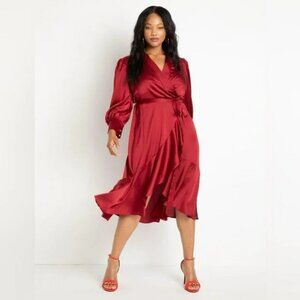 ELOQUII Satin Bishop Sleeve Wrap Dress Sz 16 Pearl Buttons on Sleeves Ruffle Hem
